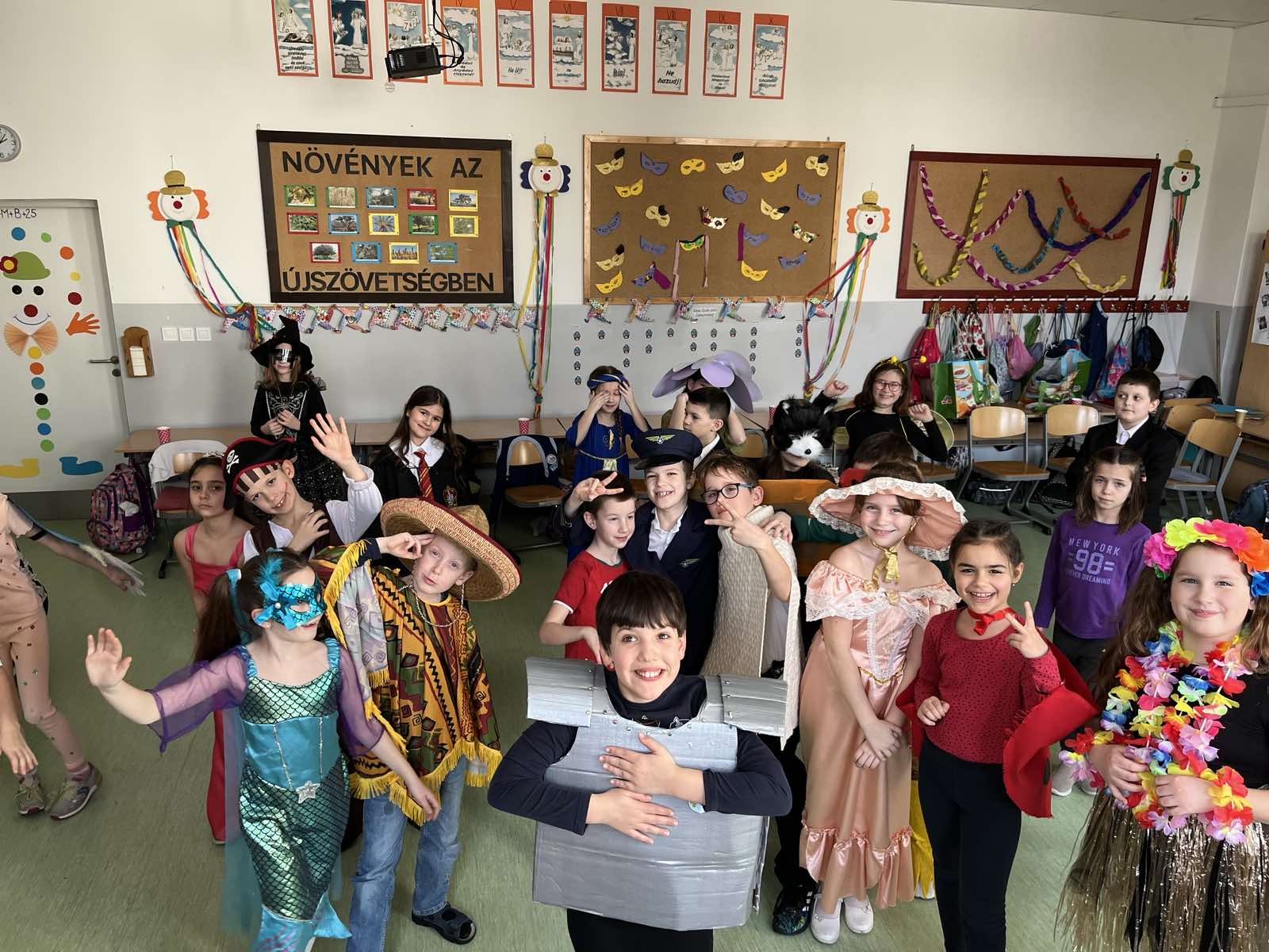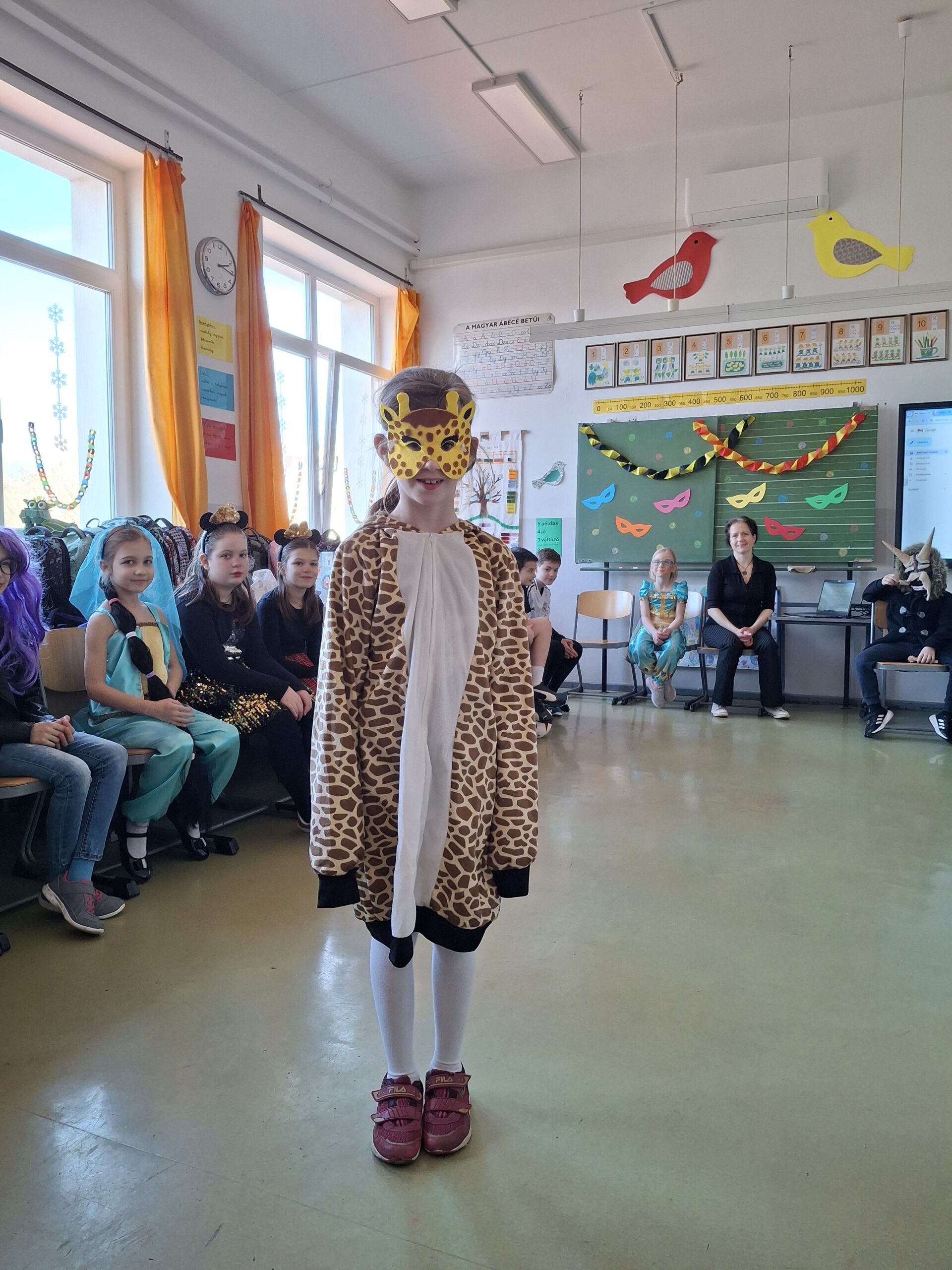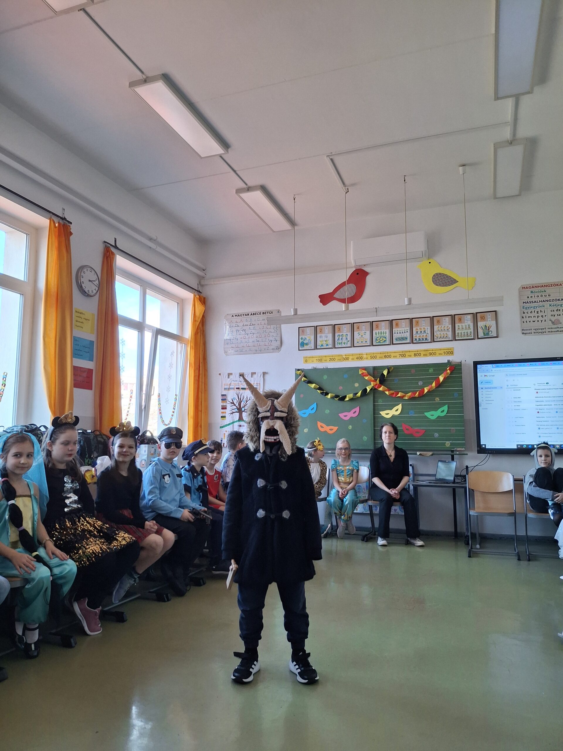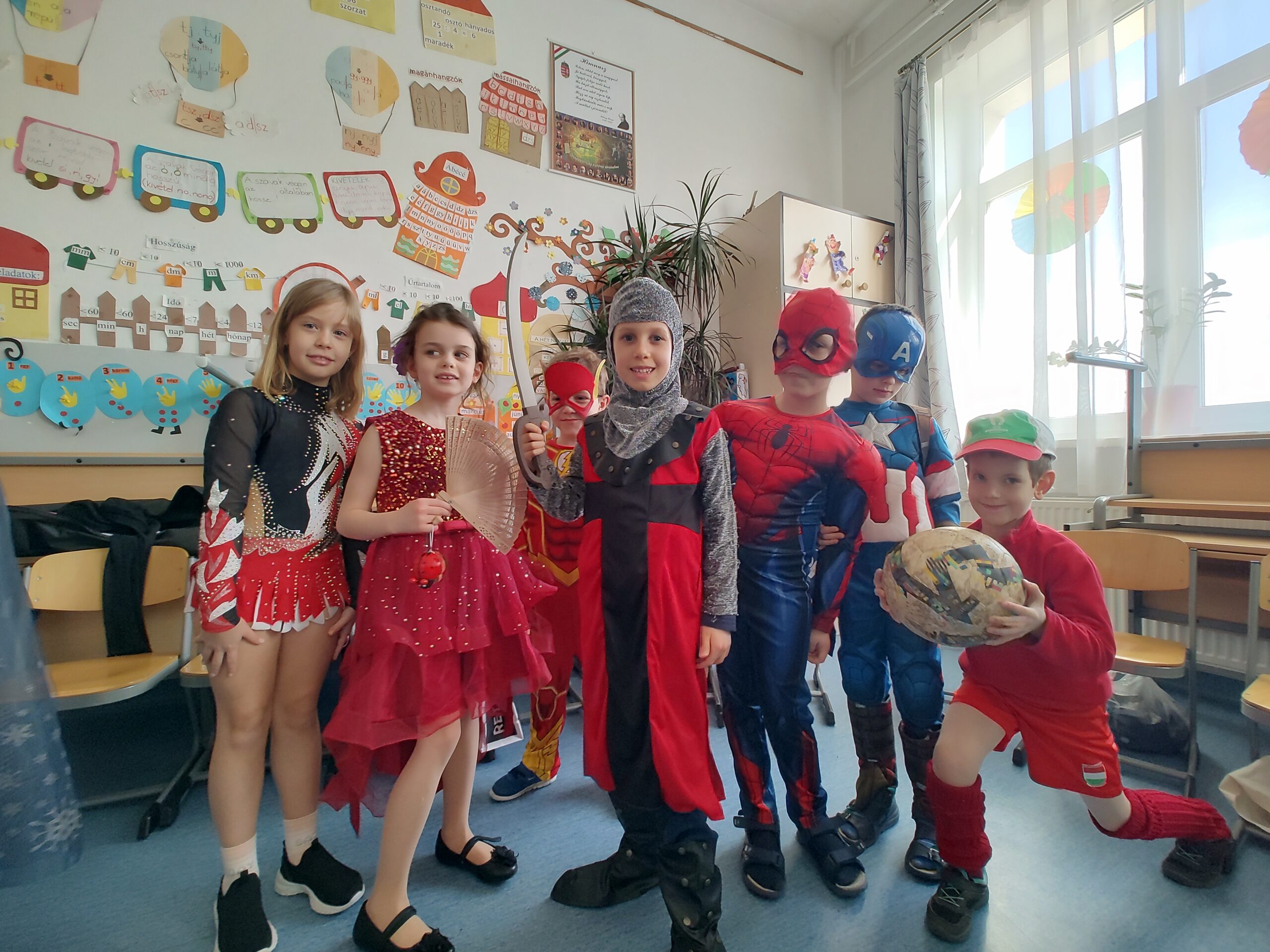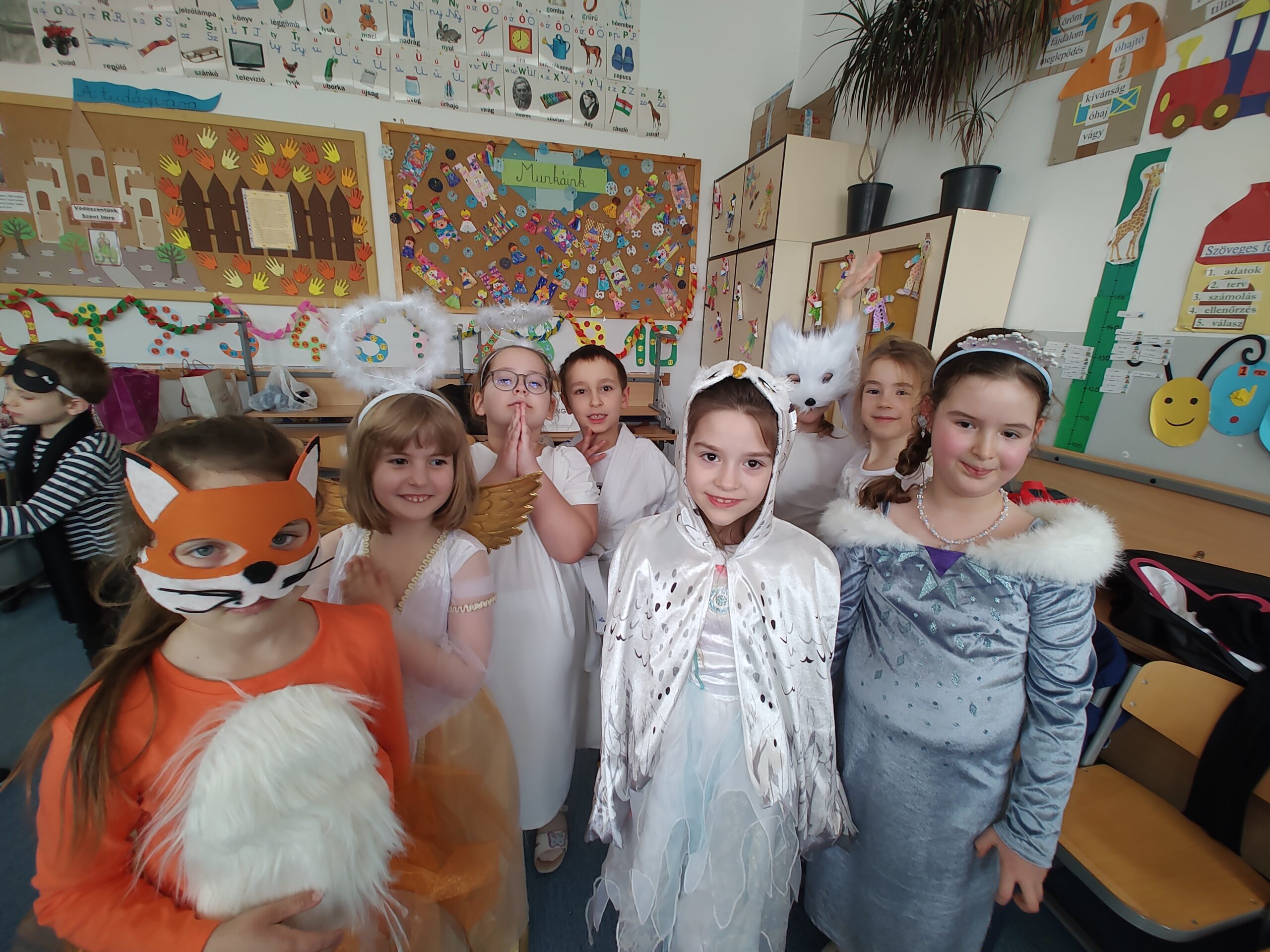 A farsang napján, délelőtt egy előadást néztünk meg a tornateremben, amelynek címe: Zöld Péter volt. Több osztályban már reggel jelmezbe bújtak a gyerekek, de az igazi mulatság ebéd után kezdődött. Volt itt székfoglaló, lufifújó verseny, ügyességi játékok…és még sok vicces feladat. A játék után elfogyasztottuk a finom süteményeket, szendvicseket, gyümölcsleveket, amelyeket a szülők nagy gonddal készítettek számunkra. Még farsangi fánk is volt, amely mindenki kedvence lett!