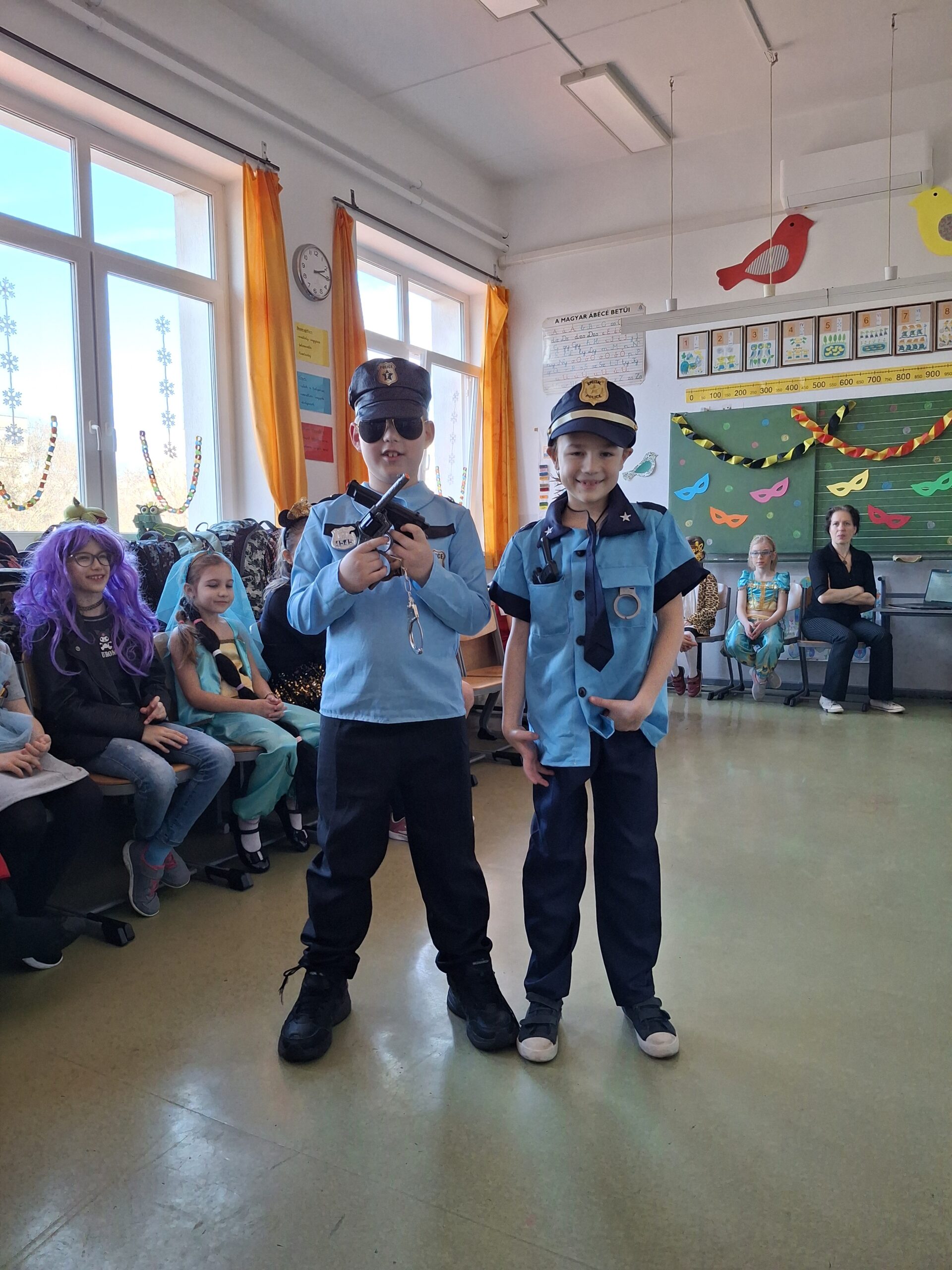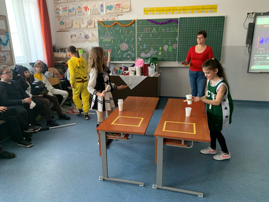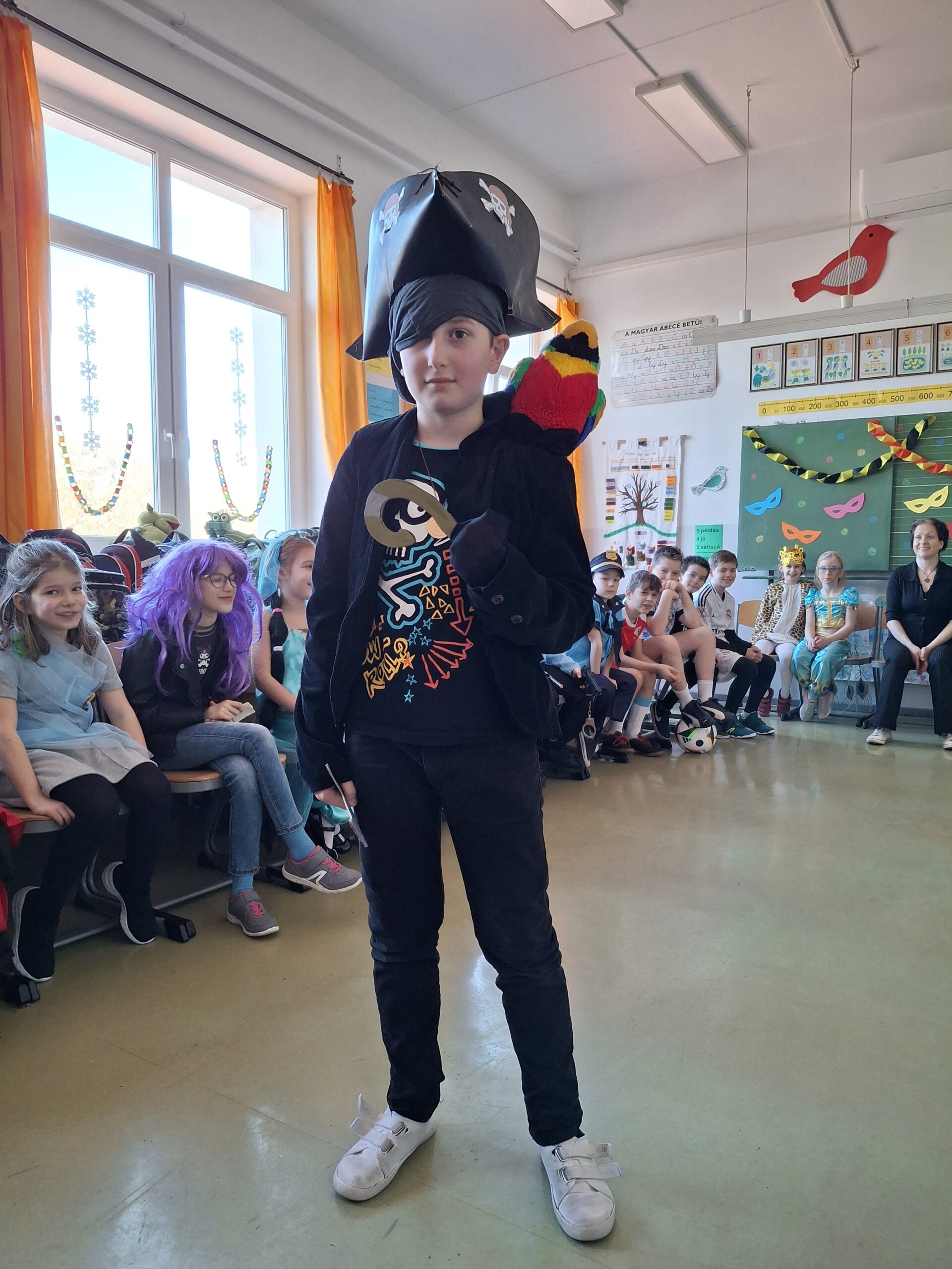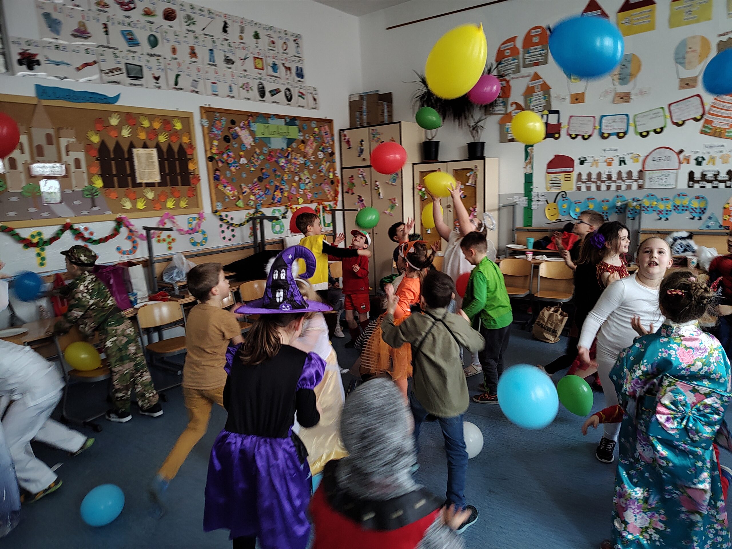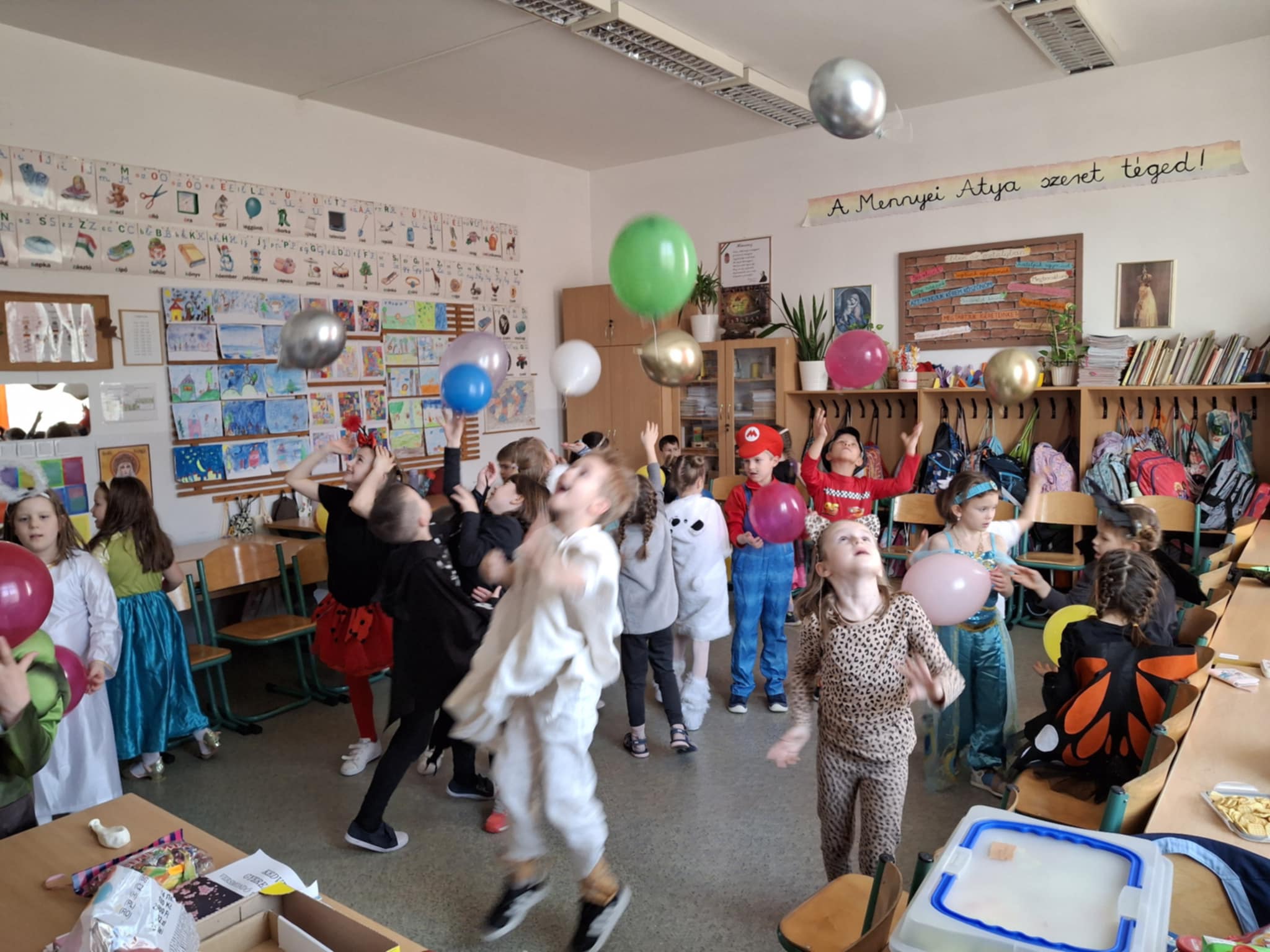 A farsang napján, délelőtt egy előadást néztünk meg a tornateremben, amelynek címe: Zöld Péter volt. Több osztályban már reggel jelmezbe bújtak a gyerekek, de az igazi mulatság ebéd után kezdődött. Volt itt székfoglaló, lufifújó verseny, ügyességi játékok…és még sok vicces feladat. A játék után elfogyasztottuk a finom süteményeket, szendvicseket, gyümölcsleveket, amelyeket a szülők nagy gonddal készítettek számunkra. Még farsangi fánk is volt, amely mindenki kedvence lett!