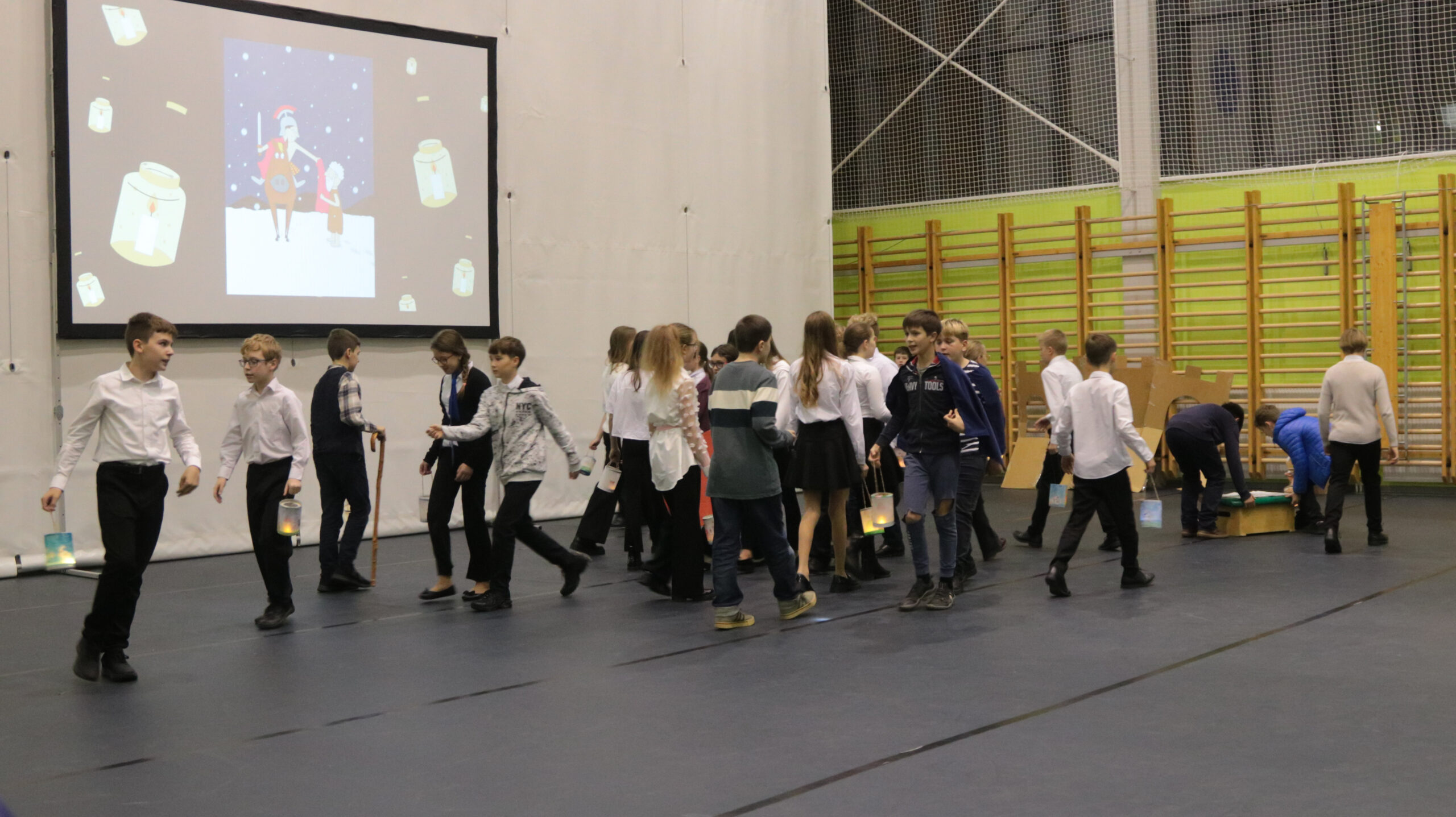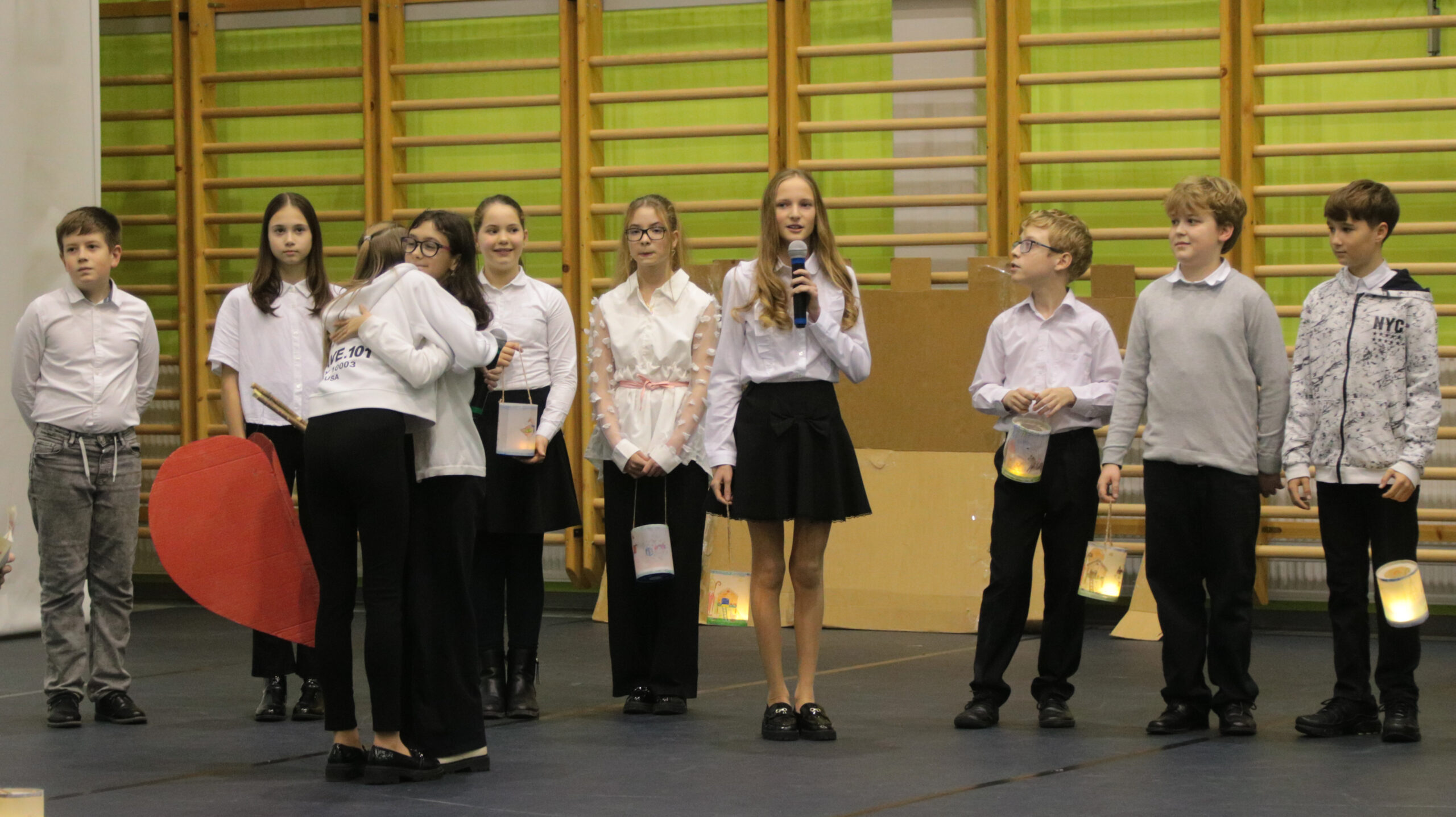 Az előadás különlegességét nemcsak a megható kerettörténet adta, amely egy család mindennapjain keresztül mutatta be, miért fontos az osztozkodás és a segítőkészség, hanem az is, hogy a diákok mindezt német nyelven adták elő. A hatodik osztályosok gyönyörű kiejtéssel, érthetően és magabiztosan beszéltek, amivel minden jelenlévőt lenyűgöztek. A lámpás történetén keresztül mesélték el, hogyan hozhatunk fényt mások életébe. A két főhősünk Laura és Marian együtt készültek a Márton-napi felvonulásra, de sajnos Laura lámpás nélkül maradt. Szent Márton és a koldus történetét megismerve Marian arra jutott, ő is követi a jó példát és megosztja lámpását barátnőjével.