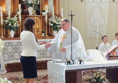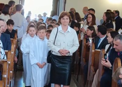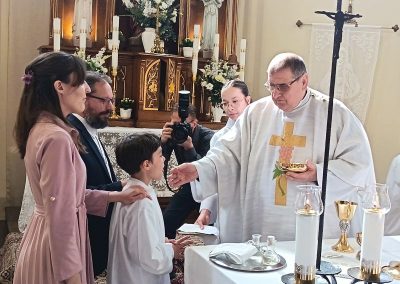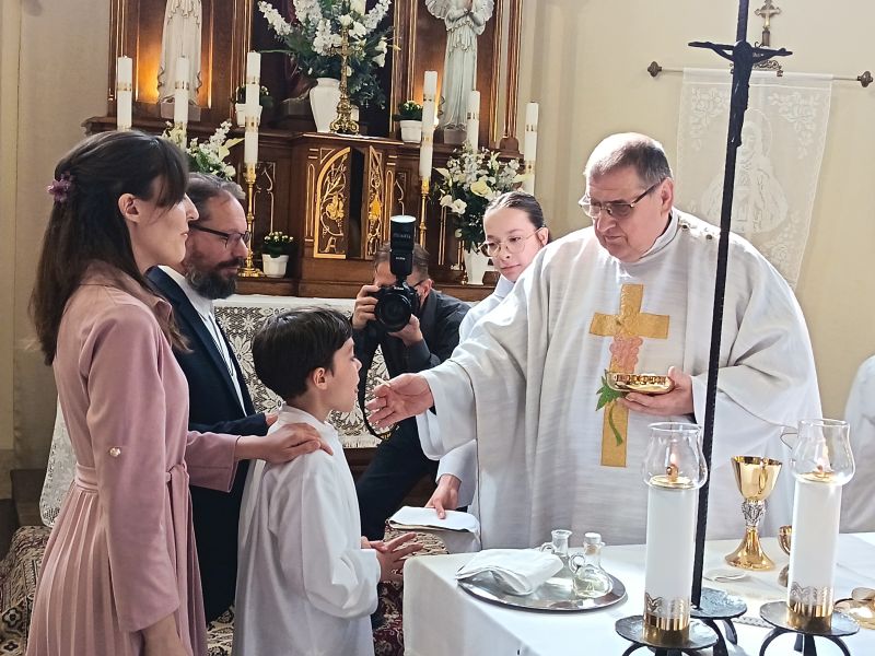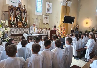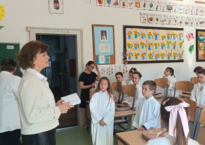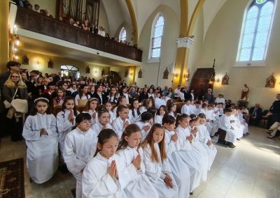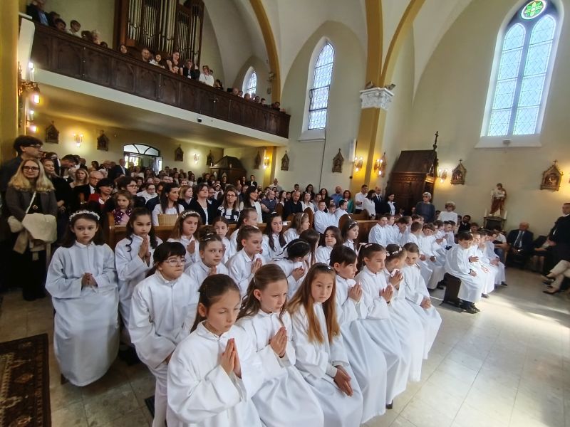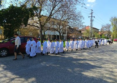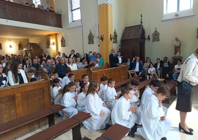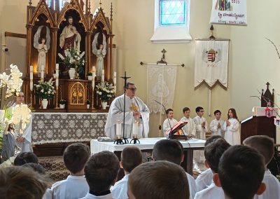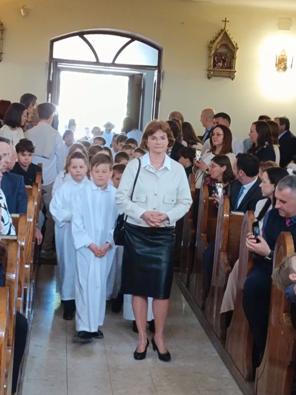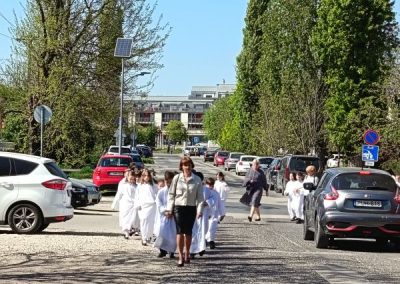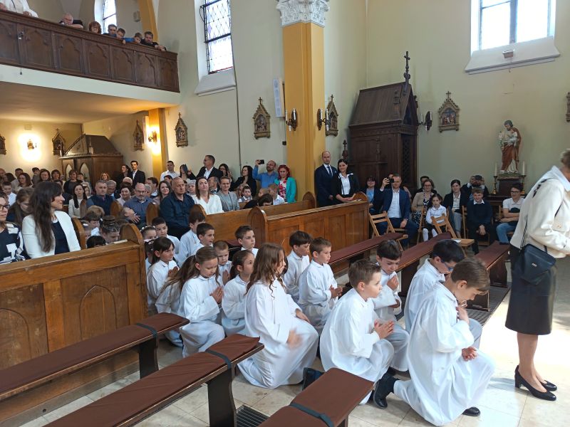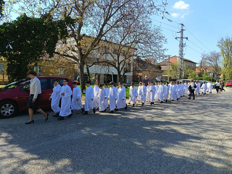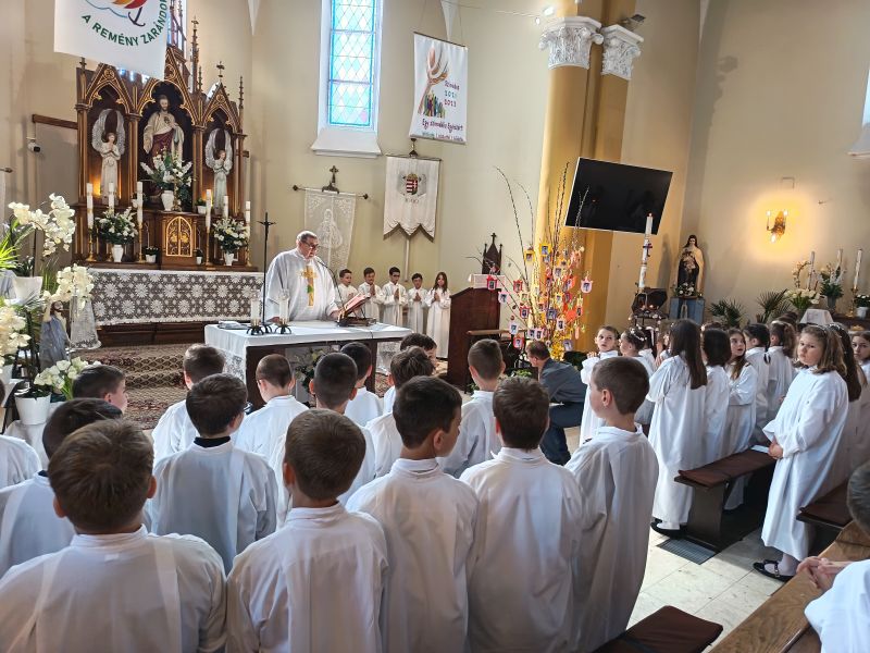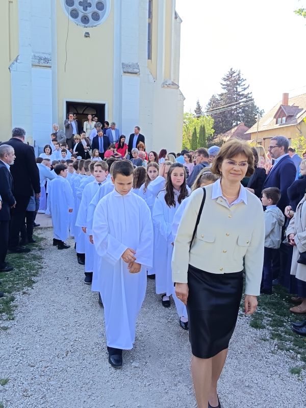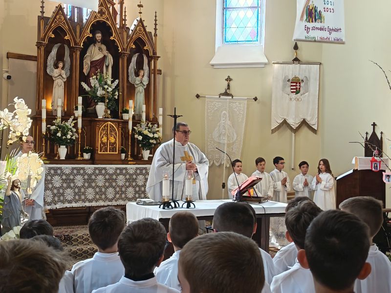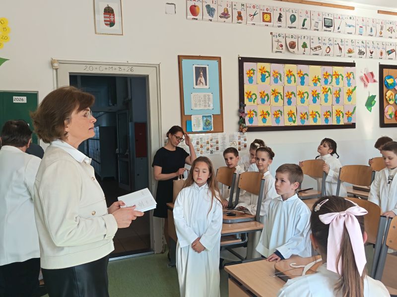 Gyönyörű napra ébredtünk április 18-án szombaton, amikor eljött a régóta várt nap, a harmadik évfolyam 48 gyermekének Elsőáldozása. Délelőtt a gyerekek szüleikkel együtt gyülekeztek az Érd-Újváros-i Jézus Szíve templomnál, ahol először a gyermekek, majd szüleik végezhették el szentgyónásukat. Ebben, mint minden évben, Mojzer György atya volt segítségünkre. Ezután egy különleges és megható élményben lehetett részünk. Az egyik elsőáldozó kisgyermek édesanyja és nagymamája együtt részesült a keresztség szentségében. A keresztelő után rövid próba következett. Délután szép ünneplő ruhában érkeztek a gyerekek az iskolába, ahol felvették a hosszú, fehér albájukat, majd elindultunk a templomba. A szentmise prédikációjában Ferenc atya, utalva az evangéliumban hallott emmauszi tanítványok történetére, elmondta, milyen fontos, hogy Jézus az életünk része legyen, mert Ő mindig velünk van, életünk nehéz szakaszaiban is és Rá mindig számíthatunk. A szentmise végén a szülőkhöz is intézett egy pár gondolatot, köszönetet mondott nekik és kérte őket, hogy személyes példájukkal segítsék gyermekület a jézusi úton. A közös fénykép elkészülte után visszamentünk az iskolába, a gyerekek levették az ünnepi albát, megkapták az elsőáldozási emléklapot, majd mindenki otthon, családi körben folytathatta az ünneplést. Hálás szívvel szeretnék köszönetet mondani mindenkinek, aki bármilyen módon hozzájárult ahhoz, hogy szépen, méltó módon tudtuk megünnepelni az idei tanév Elsőáldozását.