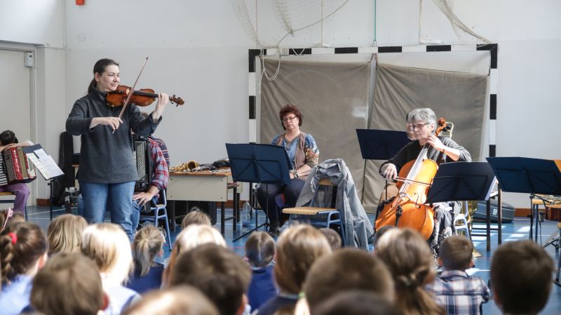 Iskolánk 4 zenét tanuló diákjával és a zeneiskola hangszert oktató pedagógusaival interaktív, izgalmas órán vehettünk rész. A diákok által kedvelt és ismert dallamok, mint magyar népmesék, Vuk, A nagy ho-ho-ho horgász, no és A Karib-tenger kalózainak felcsendülése közben megismerkedtünk a vonós, fúvós, billentyűs és ütős hangszercsaládok különböző tagjaival.