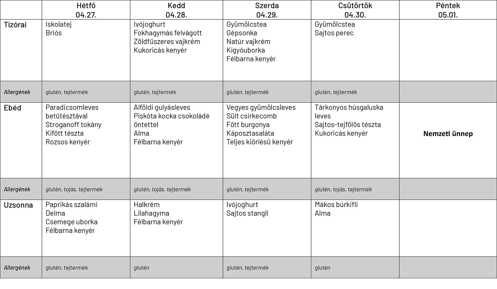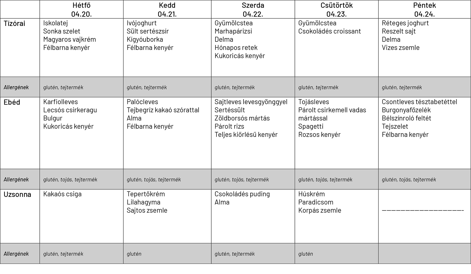 Étlap április 20-24. április 27-30. Étkezési térítési díjak Étkezési térítési díjak befizetése Az étkezési térítési díjak befizetése 2020. szeptember 1-től átutalással történik az alábbi számlaszámra: 10700574-47413500-51200002 Megértésüket köszönjük!